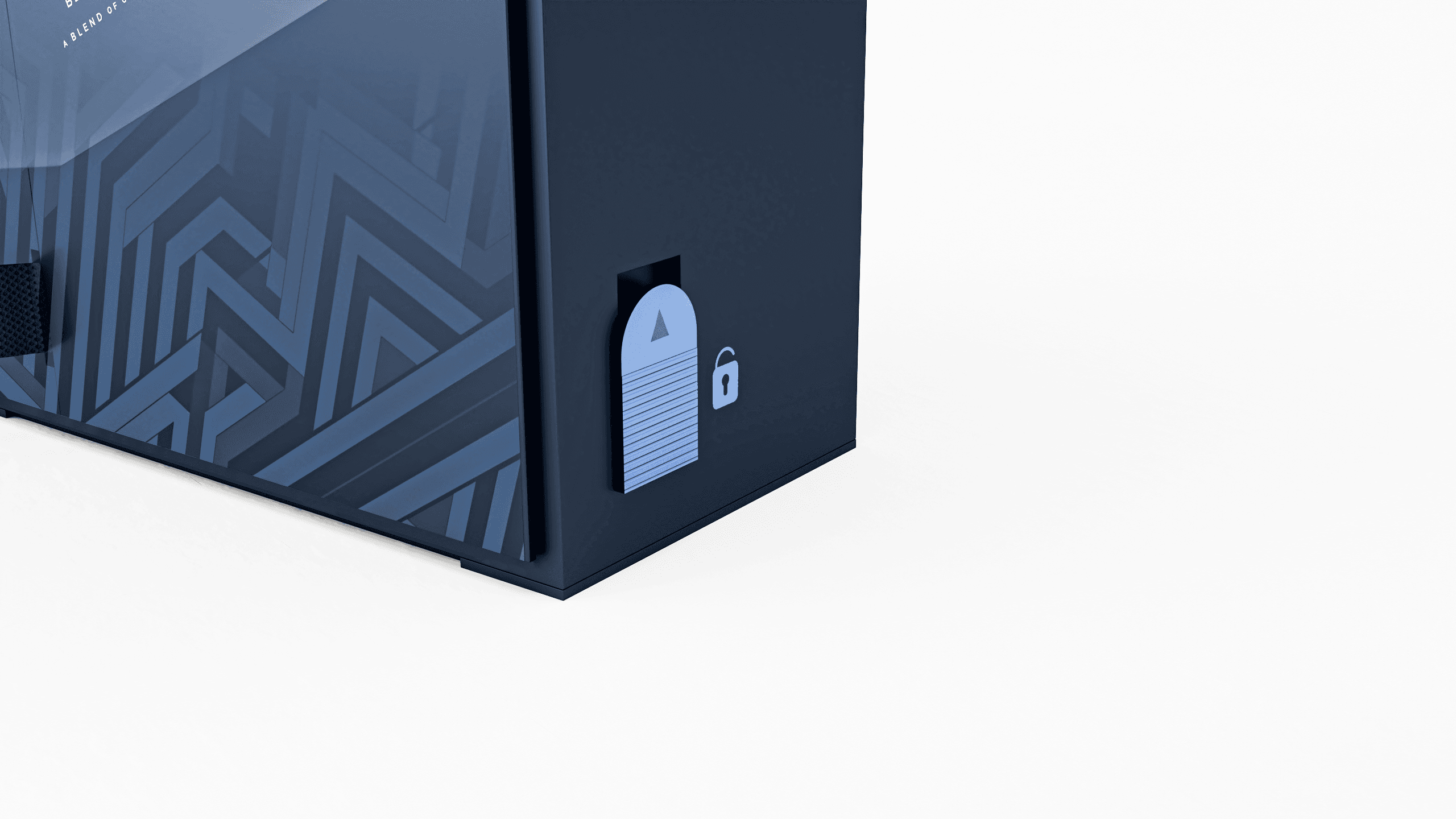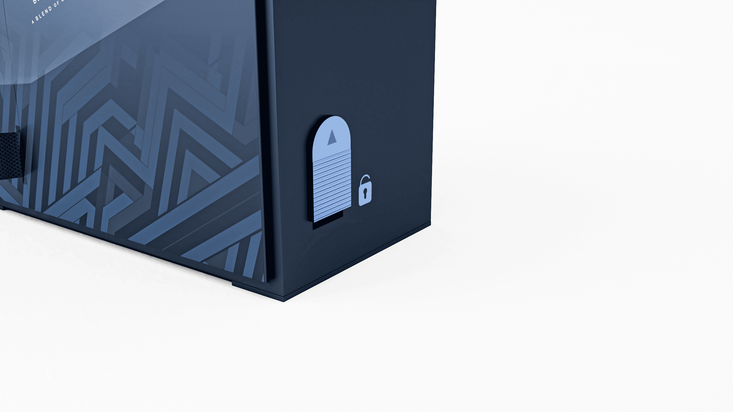 The first design is made from paper covered honeycomb cardboard. The angular Johnnie Walker front motif leads the user to a secured latch on the side. The honeycomb allows for luxuriously thick walls, whilst simultaneously saving weight.