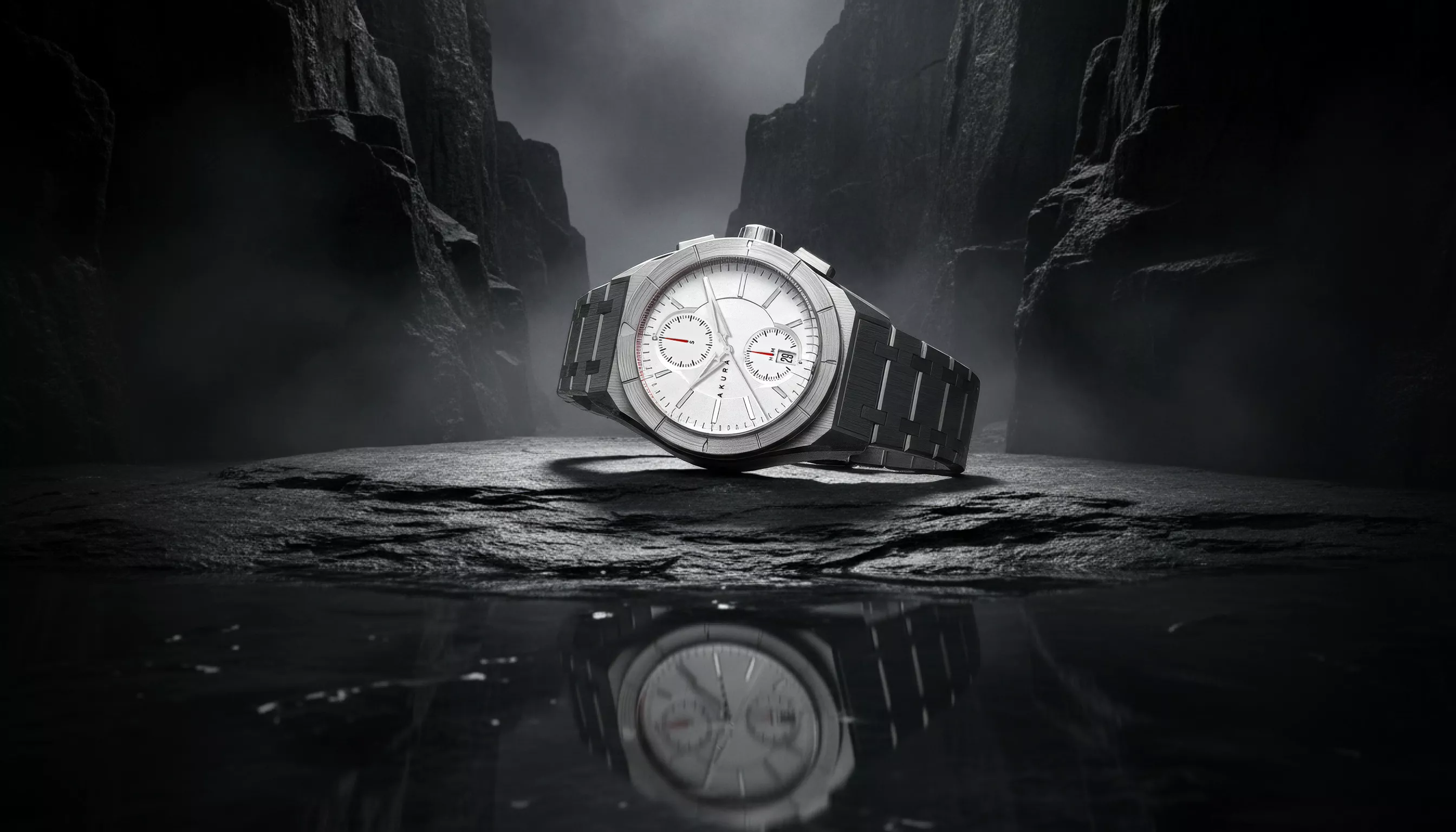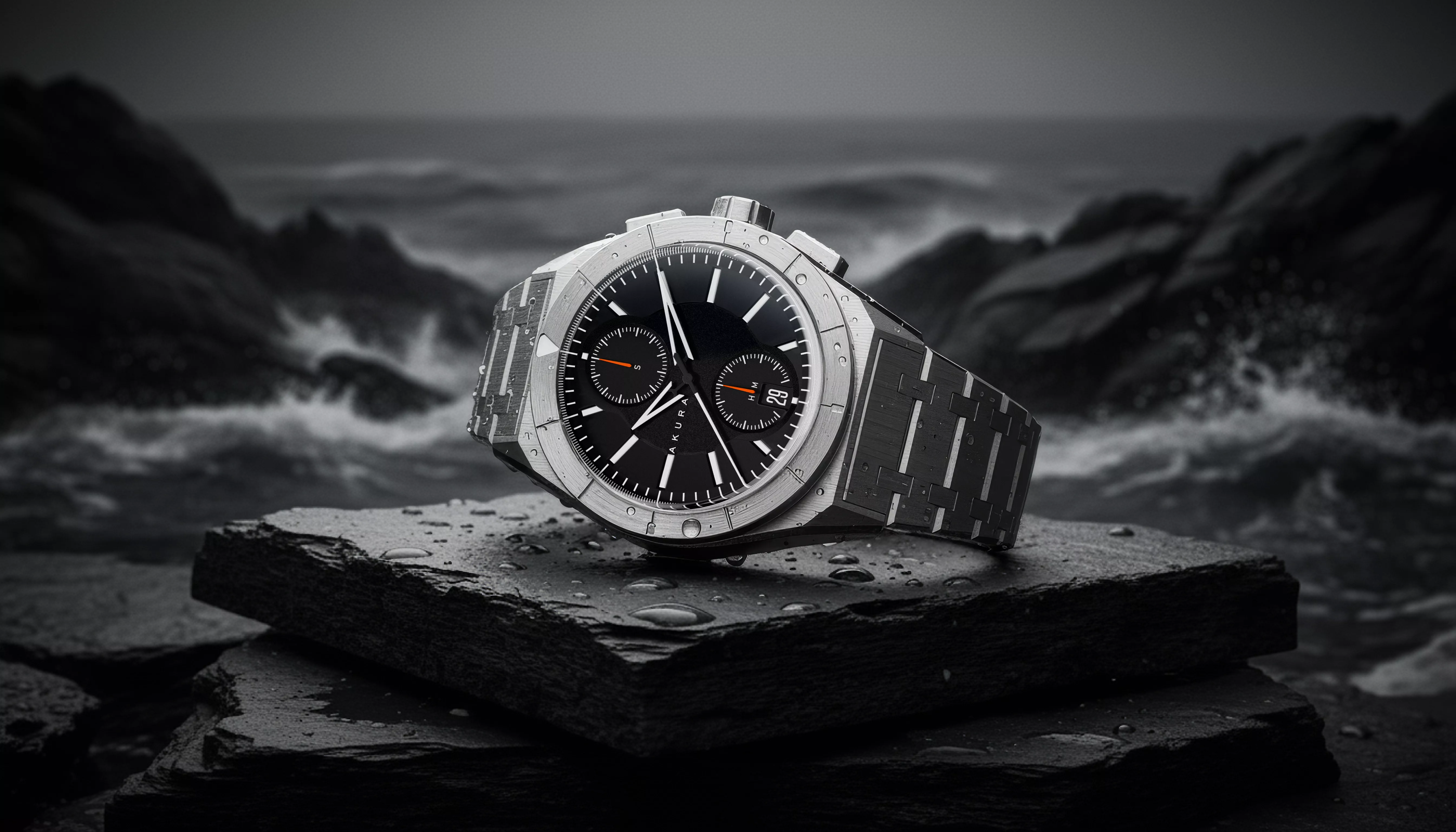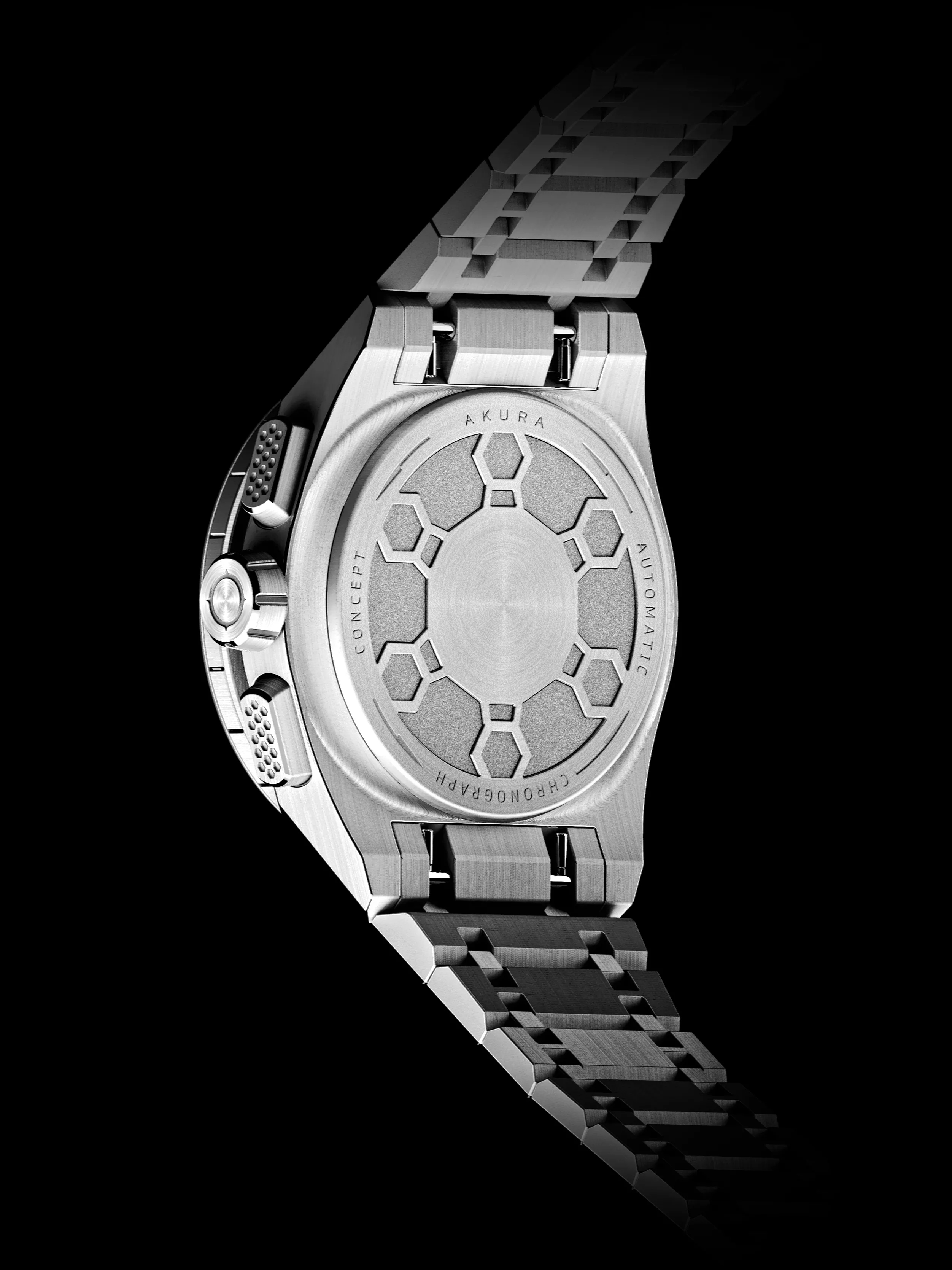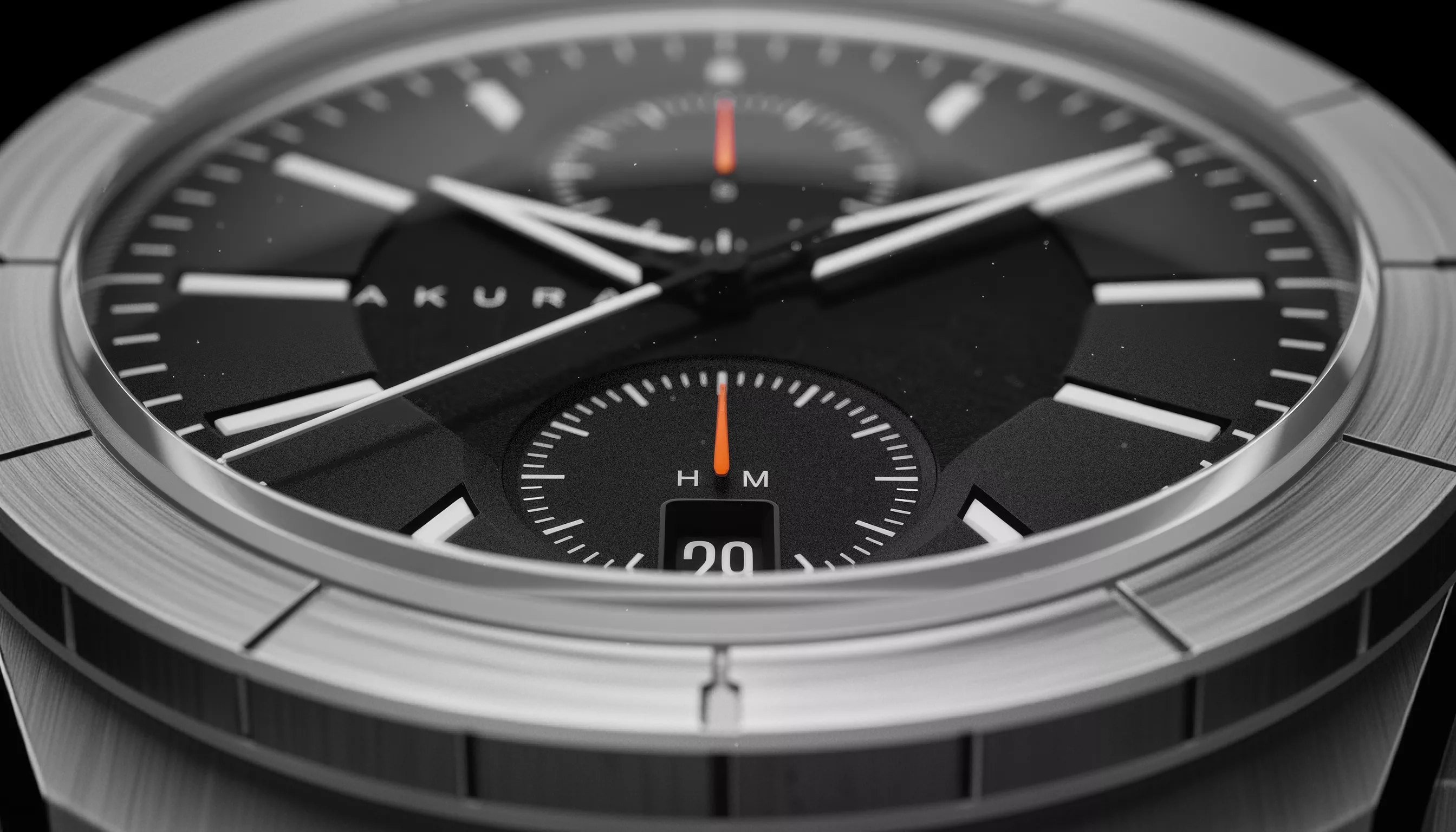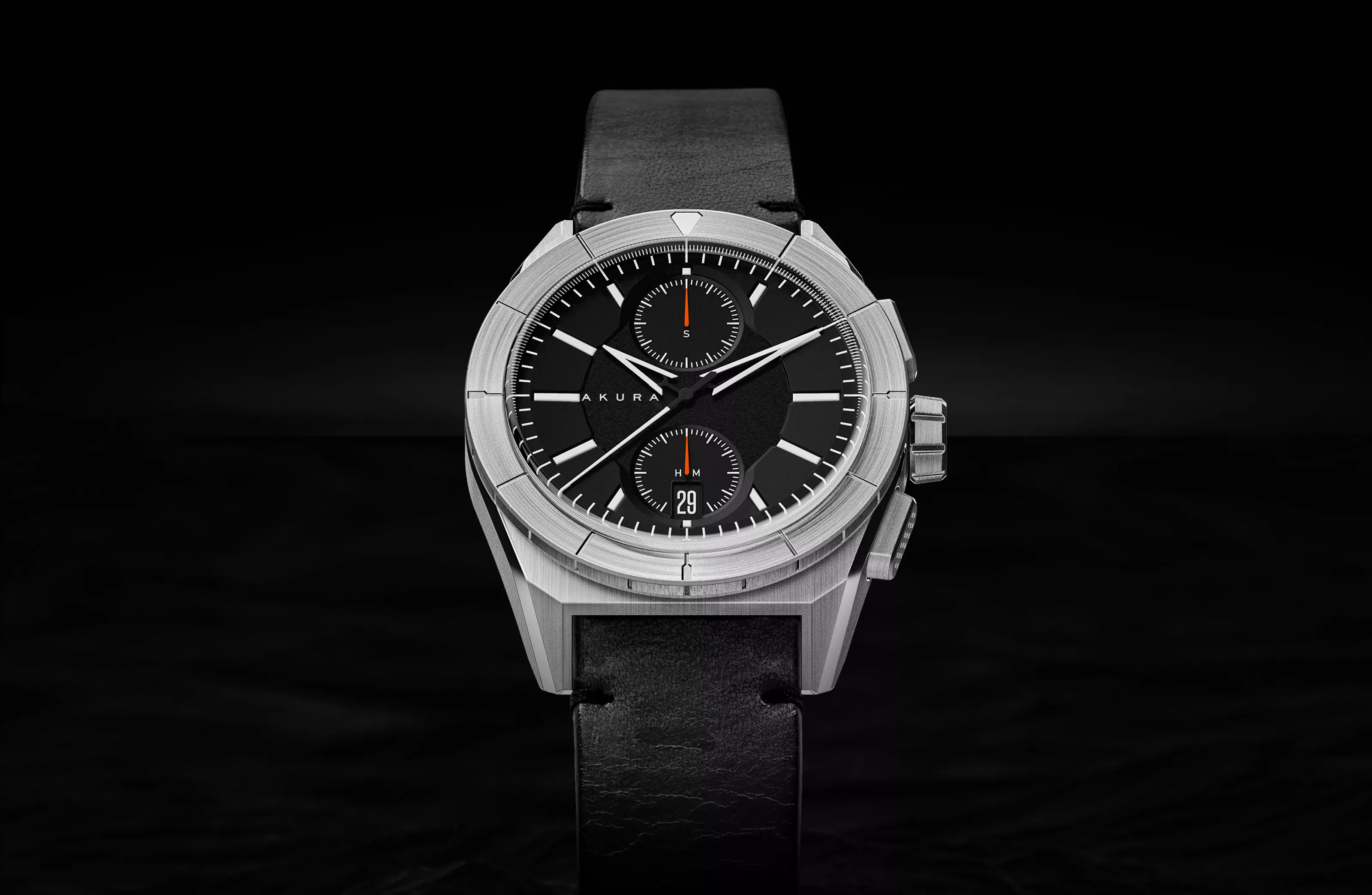 The Akura Chronograph concept communicates rugged tool watch aesthetics through the use of flat surfaces and sharp geometric angles. A multilayered dial retains strong legibility. A rich history in Chronograph design is drawn from, with watches such as the original all-metal Omega Speedmaster serving as inspiration.