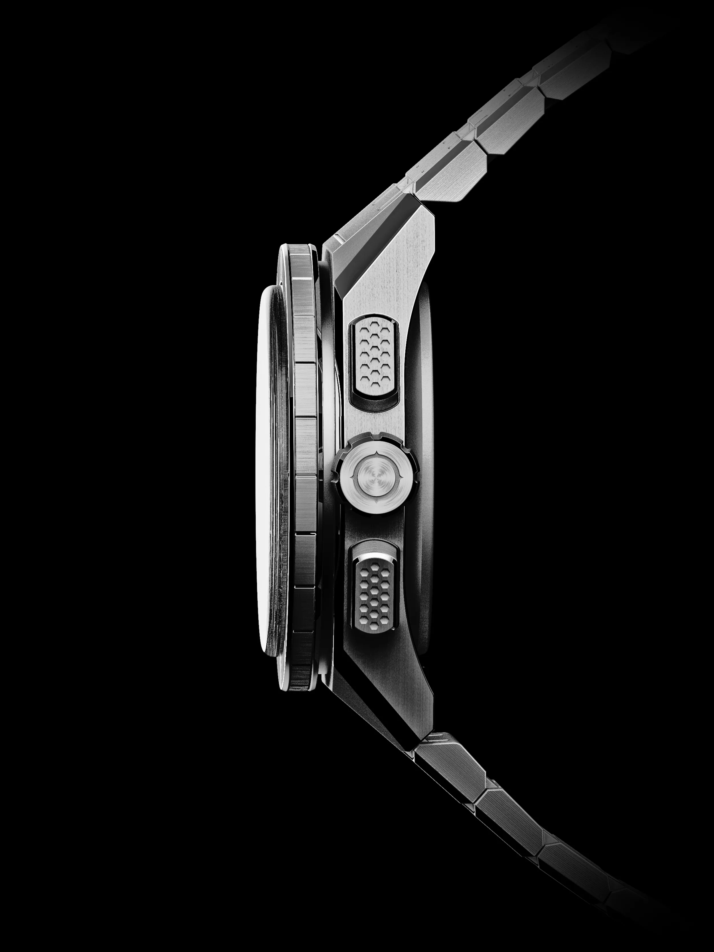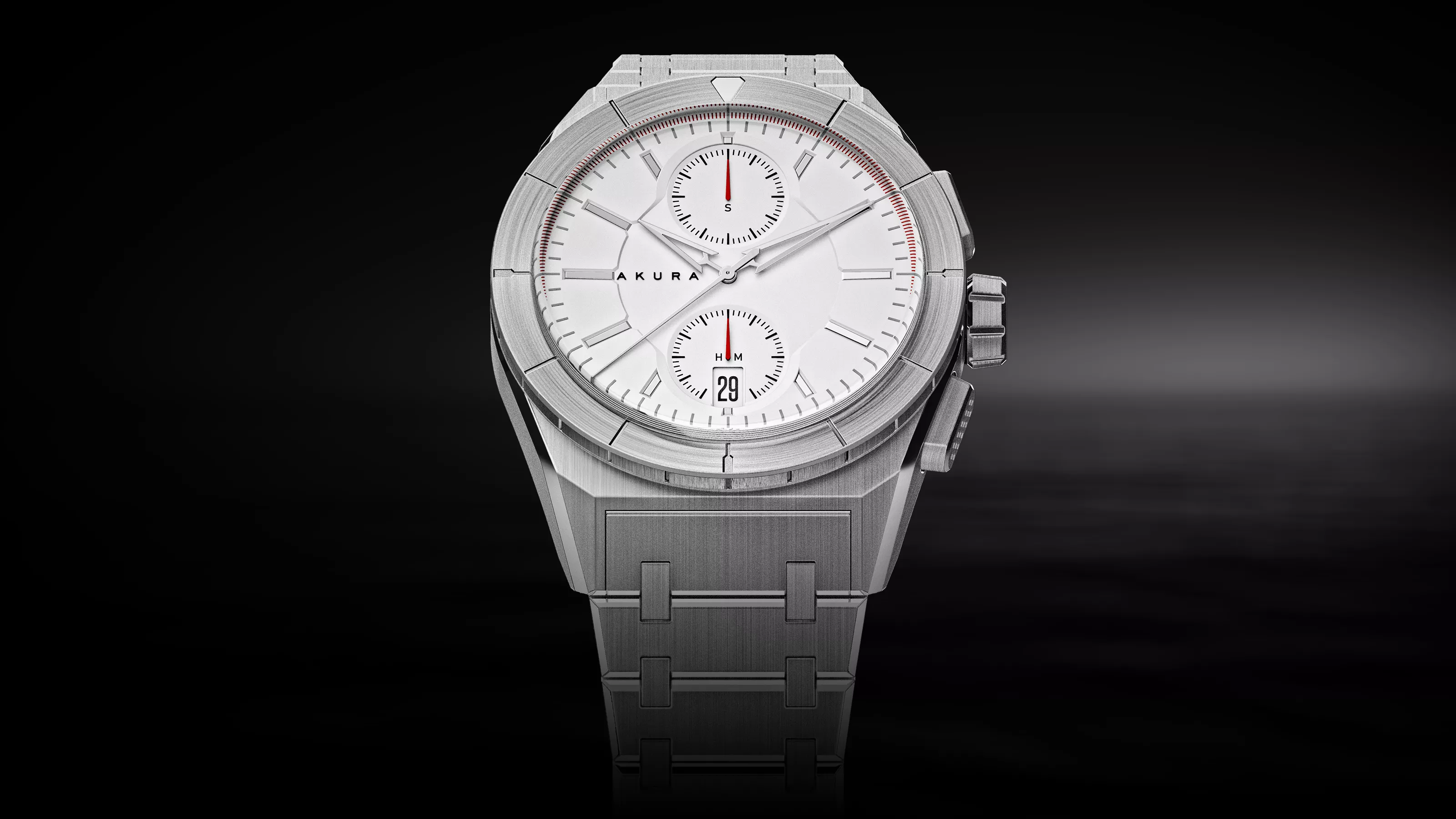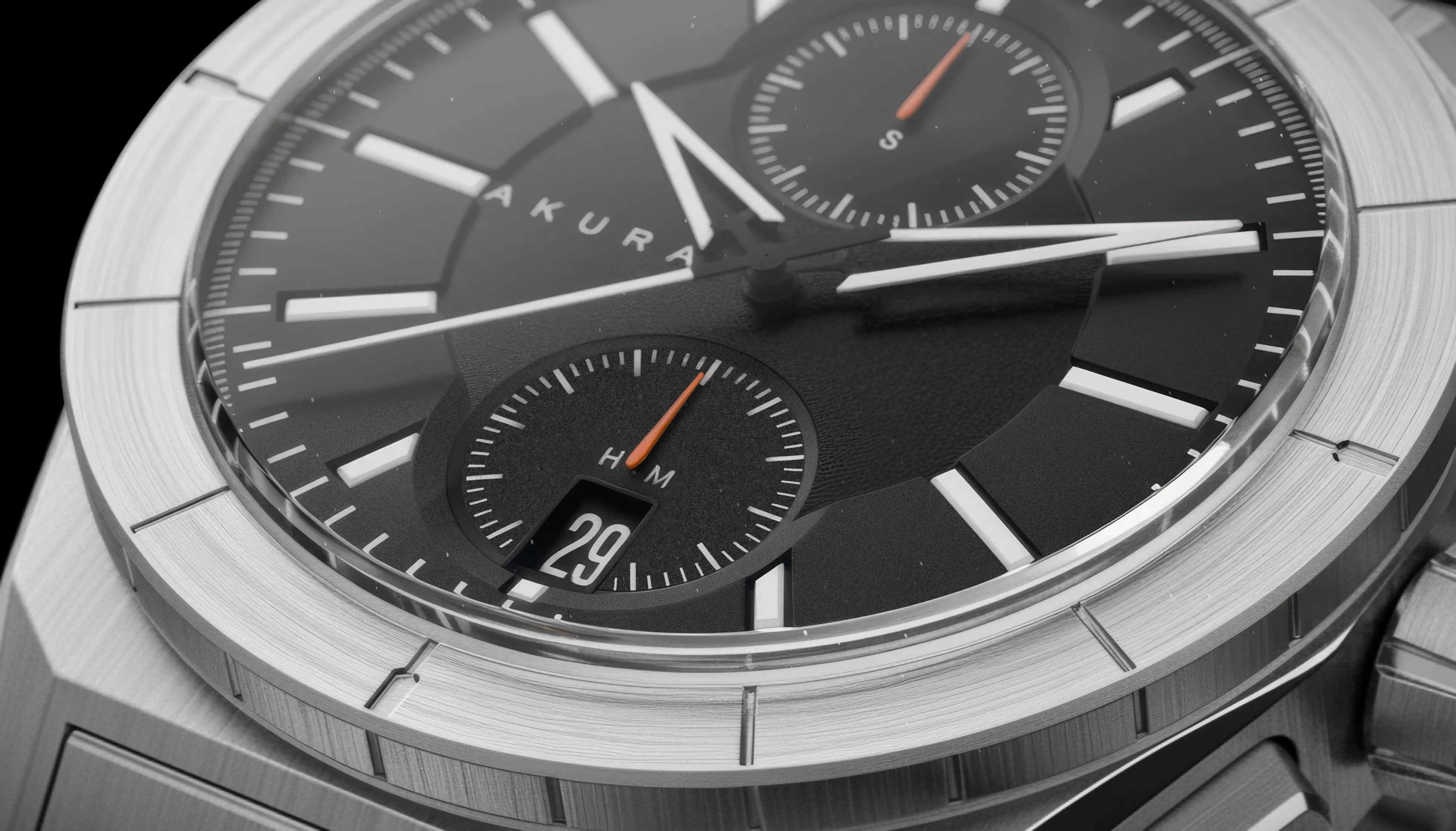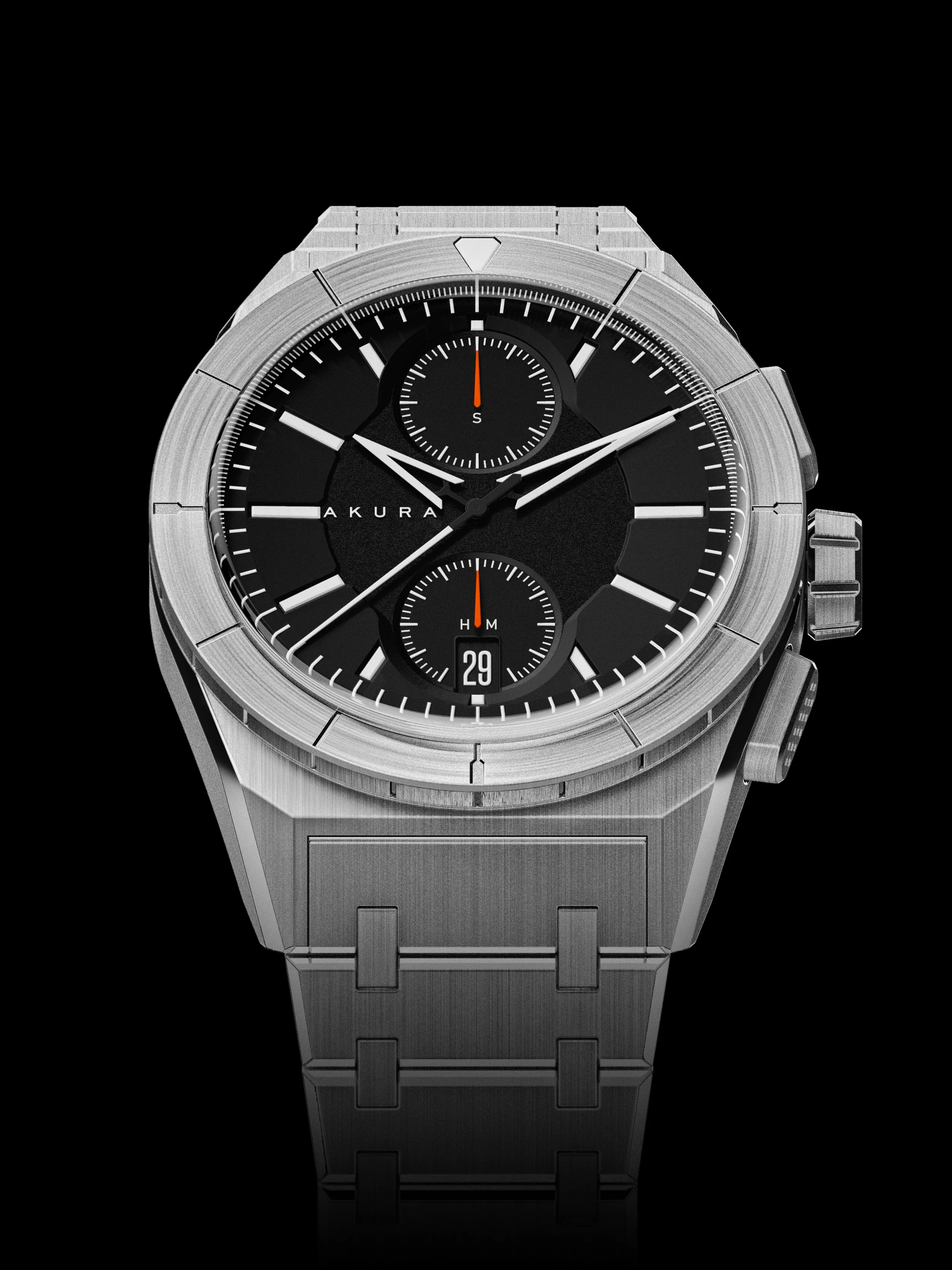 The Akura Chronograph was an interesting design challenge for both dial and case. Using multiple layers to create an attractive, sleek case side profile was a priority for the case to fit the chronograph movement with its increased height.
