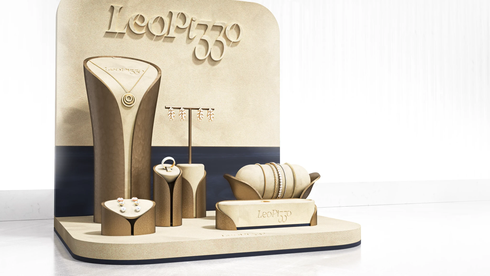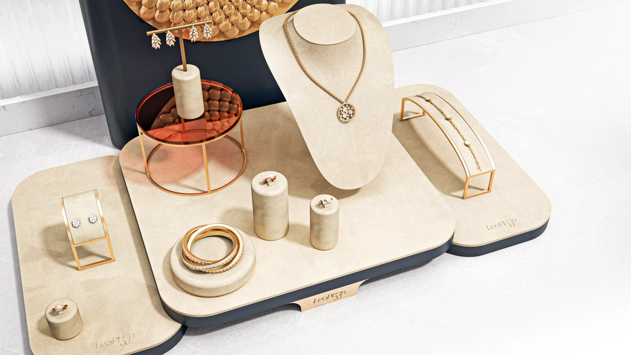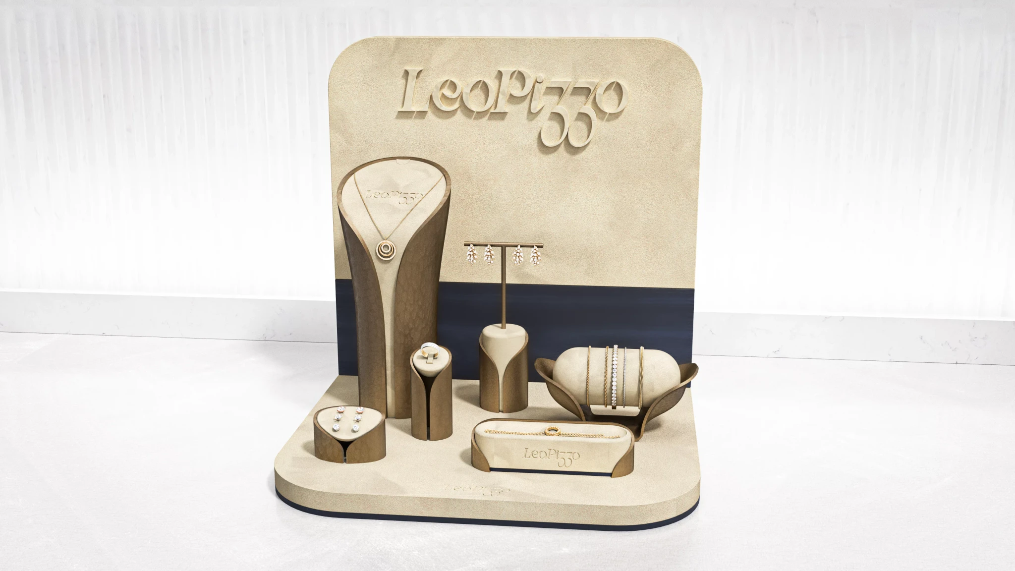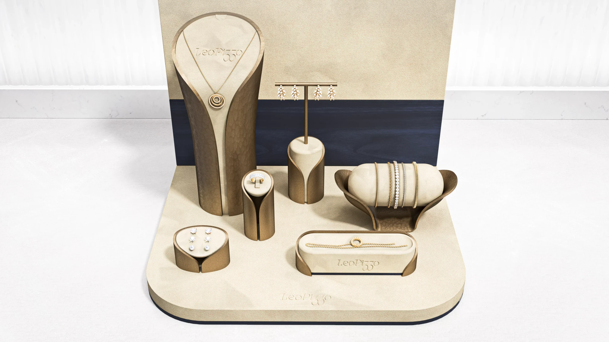 Cream coloured suede dominates the presentation surface with brass metal stands creating elevation.