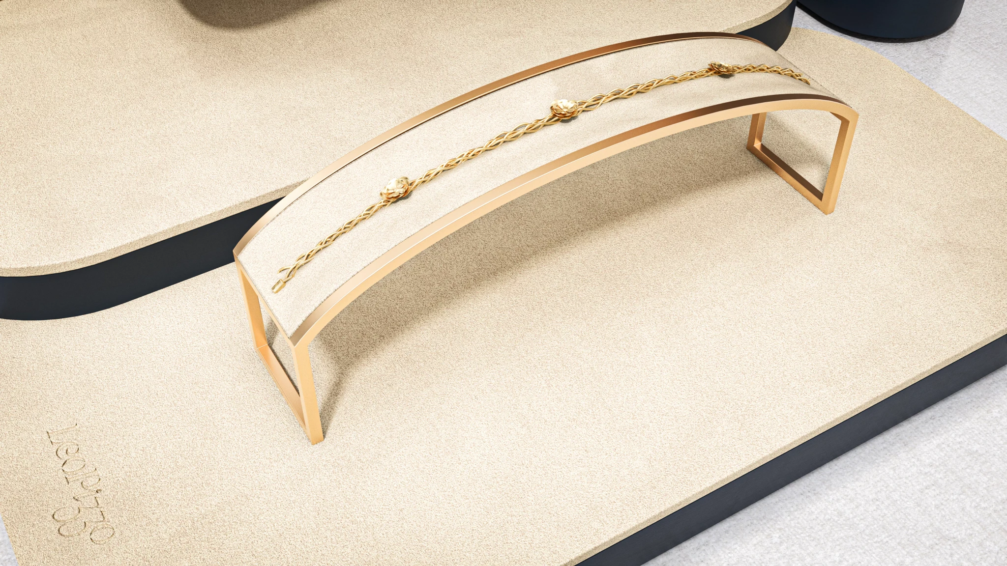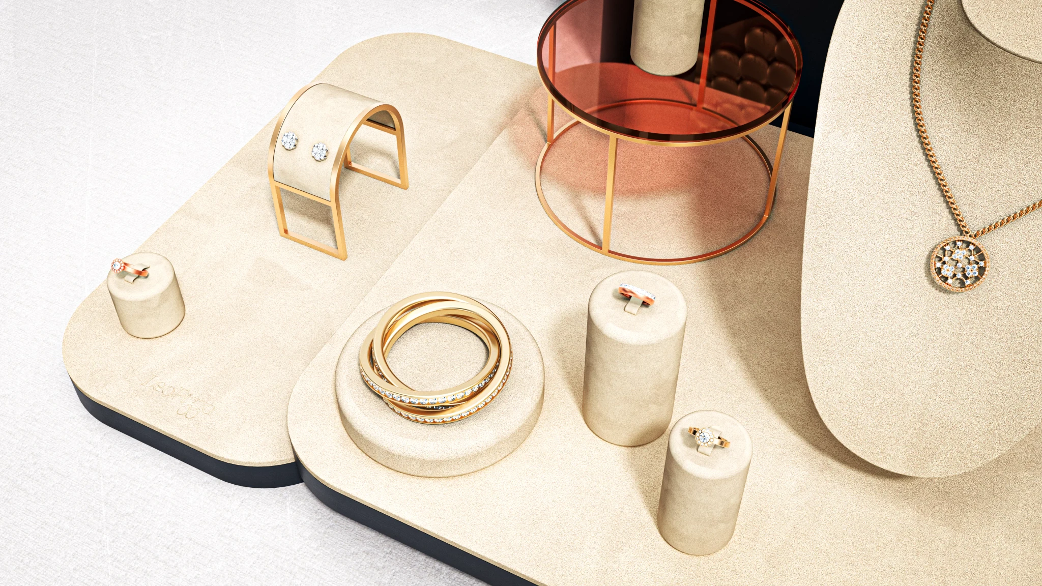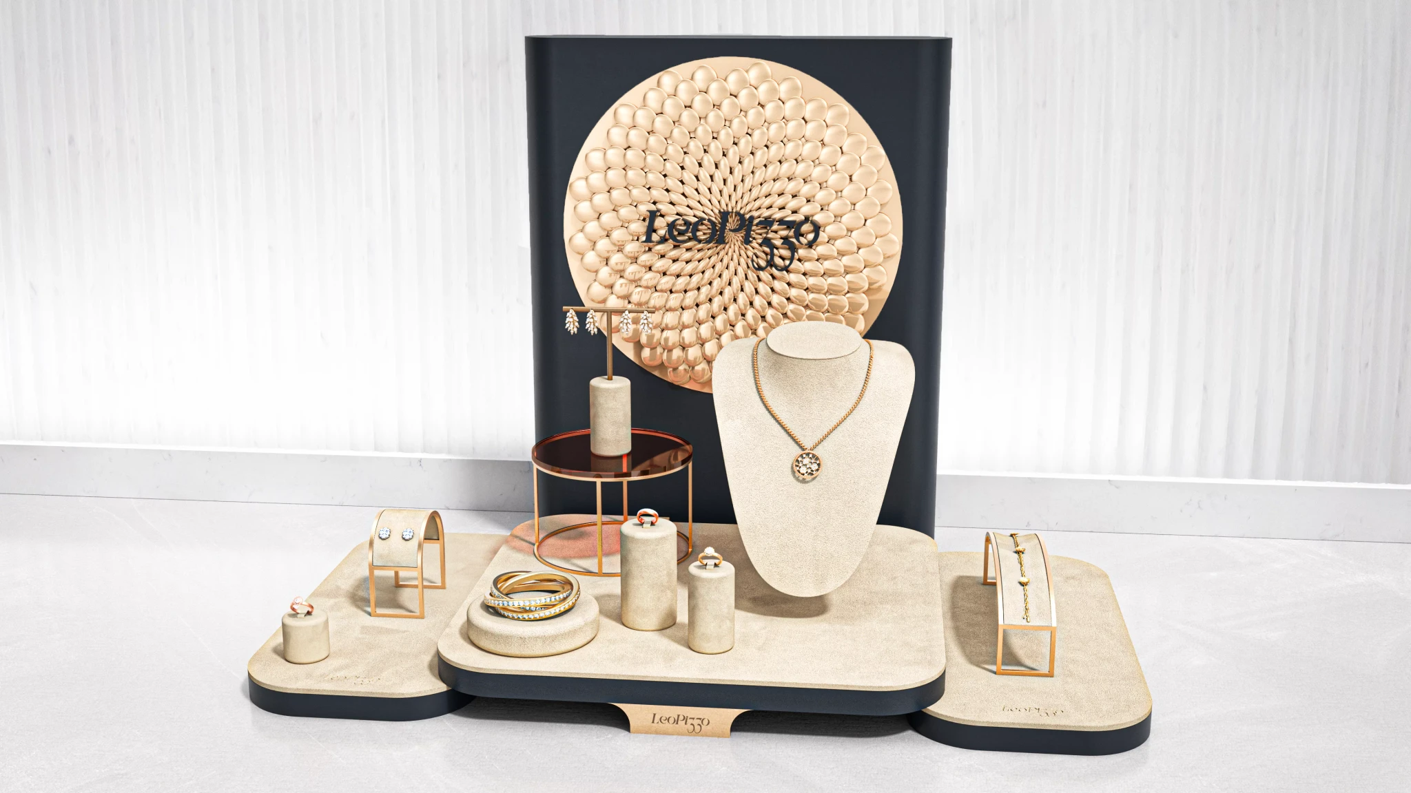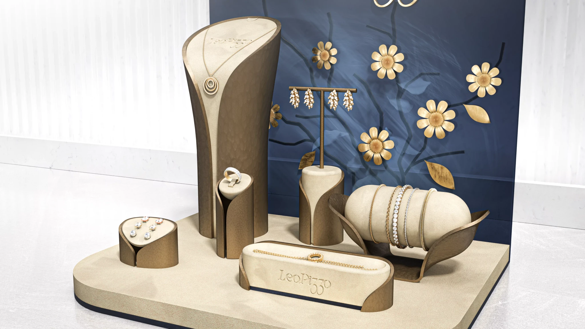 Cream coloured suede dominates the presentation surface with brass metal stands creating elevation.